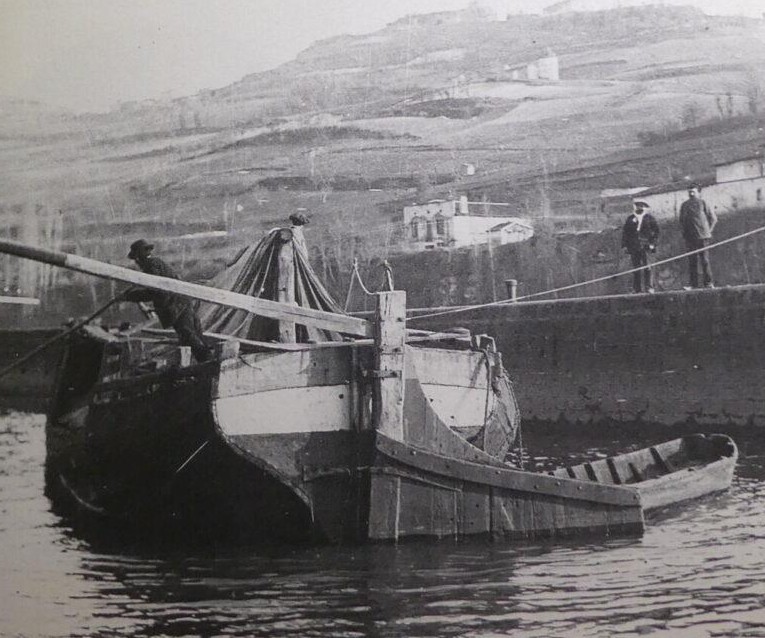 Image d’archives d’une gabarre à l'accostage sur la vallée du Lot au début du XXe siècle.